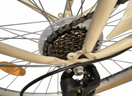 Jego zaawansowany system biegów, oparty na 7-rzędowej przerzutce Shimano, pozwala na płynne i łatwe przełączanie biegów, a jednocześnie zapewnia odpowiednią siłę napędu na różnorodnych trasach. Frontowy i tylny hamulec typu V-Brake gwarantują bezpieczeństwo i skuteczność hamowania, co jest niezbędne w miejskim ruchu.