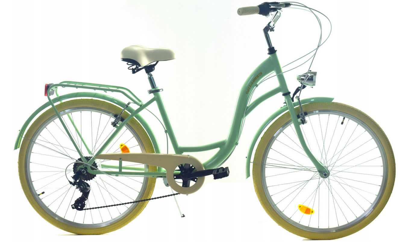 Opony o rozmiarze 26x1,75 oferują dobrą przyczepność, co czyni rower idealnym towarzyszem na miejskich ulicach. Komfortowe siedzenie na sprężynie i stalowa kierownica sprawiają, że każda podróż jest przyjemnością. Rower wyposażony jest również w praktyczne akcesoria, takie jak błotniki, bagażnik, podpórka, osłona łańcucha oraz oświetlenie LED, co znacząco zwiększa jego funkcjonalność. Dodatkowo, dzwonek pozwoli na bezpieczne poruszanie się w ruchu miejskim.