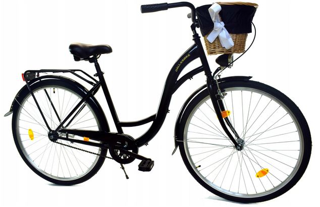 Wyposażenie: błotniki, bagażnik, podpórka, osłona łańcucha, oświetlenie LED, kosz wiklina, pokrowiec