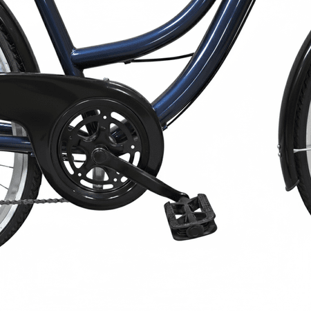 Rower został starannie zaprojektowany z myślą o komforcie użytkownika. Siodło na sprężynie oraz stalowa kierownica zapewniają wygodną pozycję podczas jazdy. Dodatkowe akcesoria, takie jak błotniki, bagażnik, podpórka oraz osłona łańcucha, czynią go w pełni funkcjonalnym wyborem dla miejskich rowerzystów. Oświetlenie LED i dzwonek zwiększają bezpieczeństwo i komfort jazdy po zmroku.