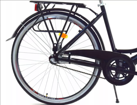 Dzięki dodatkowemu wyposażeniu, takim jak błotniki, bagażnik, podpórka, osłona łańcucha oraz oświetlenie LED (z dynama z przodu oraz baterią z tyłu), rower jest nie tylko funkcjonalny, ale także praktyczny. Dzwonek to dodatkowe udogodnienie, które zapewnia bezpieczeństwo na drodze.