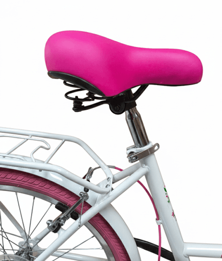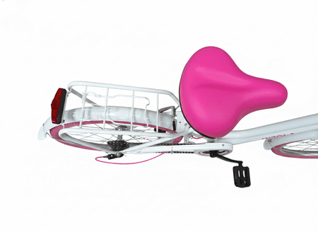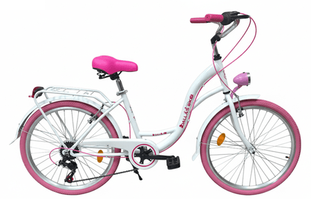 Rower wyposażony jest także w błotniki, bagażnik, podpórkę oraz osłonę łańcucha, co zwiększa jego praktyczność na co dzień. Dodatkowym atutem jest oświetlenie LED oraz dzwonek, które zapewniają bezpieczeństwo podczas jazdy po zmroku. Siodło na sprężynie oraz stalowa kierownica zapewniają wygodę i ergonomię, co sprawia, że każda przejażdżka będzie przyjemnością.