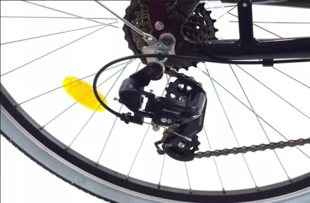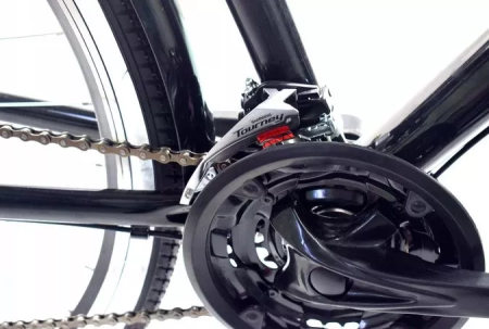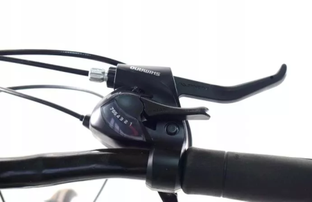 Zastosowane hamulce V-Brake z aluminium gwarantują skuteczne hamowanie zarówno na gładkich nawierzchniach, jak i podczas bardziej wymagających tras. Rower wyposażony jest w korbę 3-rzędową oraz przerzutki Shimano z przodu i z tyłu, co wpływa na płynność zmiany biegów.