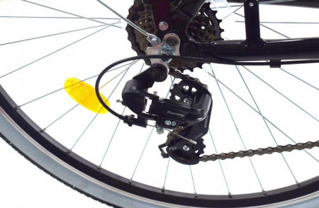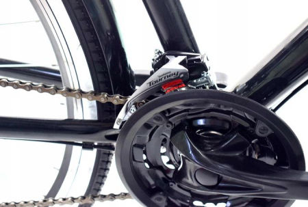 Rower posiada 3-rzędową korbę oraz piasty przednią i tylną wykonaną z aluminium, co przyczynia się do zmniejszenia wagi pojazdu. Stożkowe obręcze oraz opony o wymiarach 28x1,75 zapewniają stabilność i doskonałą przyczepność na różnych nawierzchniach. Regulowana stalowa chromowana kierownica oraz siodło na sprężynie gwarantują komfort jazdy dostosowany do indywidualnych wymagań.