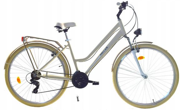 Rower Dallas City Trekking Alu wyposażony jest w aluminiowe piasty oraz stożkowe obręcze, co wpływa na jego stabilność oraz osiągi. Opony o rozmiarze 28x1,75 oferują optymalną przyczepność i komfort jazdy. Szczegółowo zaprojektowana stalowa, chromowana kierownica z regulowanym wspornikiem umożliwia łatwe dopasowanie do wzrostu użytkownika, co przekłada się na lepszą ergonomię.