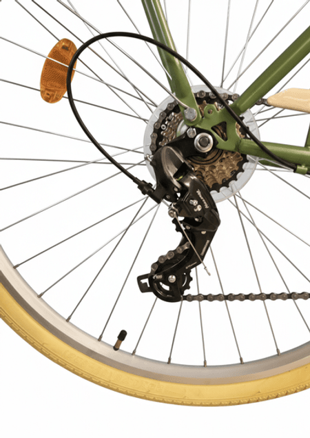 Wyposażony w 7-biegową przerzutkę Shimano, rower umożliwia łatwe dostosowanie do różnych warunków jazdy, a manetka biegów również od renomowanej marki Shimano zapewnia płynne zmiany. Przedni i tylny hamulec V-Brake skutecznie zapewnia bezpieczeństwo podczas hamowania, a aluminiowe piasty oraz stożkowe obręcze przyczyniają się do niskiej wagi i zwiększonej efektywności jazdy.