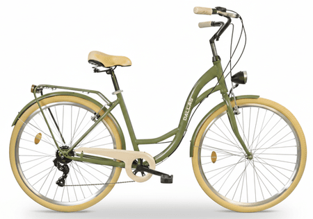 Opony o rozmiarze 26x1,75 oferują dobrą przyczepność, co czyni rower idealnym towarzyszem na miejskich ulicach. Komfortowe siedzenie na sprężynie i stalowa kierownica sprawiają, że każda podróż jest przyjemnością. Rower wyposażony jest również w praktyczne akcesoria, takie jak błotniki, bagażnik, podpórka, osłona łańcucha oraz oświetlenie LED, co znacząco zwiększa jego funkcjonalność. Dodatkowo, dzwonek pozwoli na bezpieczne poruszanie się w ruchu miejskim.